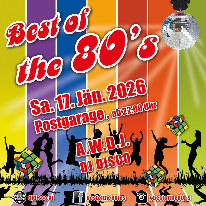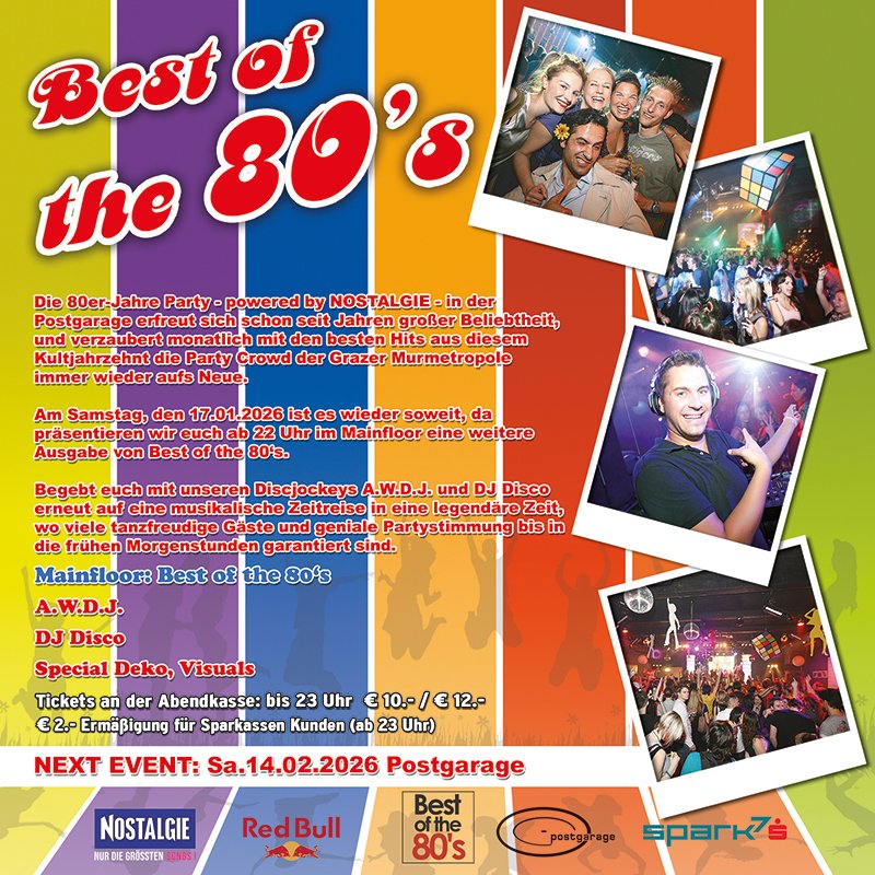 Am Samstag, den 17.01. ist es wieder soweit. Ab 22 Uhr öffnen wir die Pforten zur Jänner Ausgabe von Best of the 80's, und alle Tanz- und Partyhungrigen Gäste sind wie immer herzlich eingeladen zu uns in die Postgarage zu kommen.