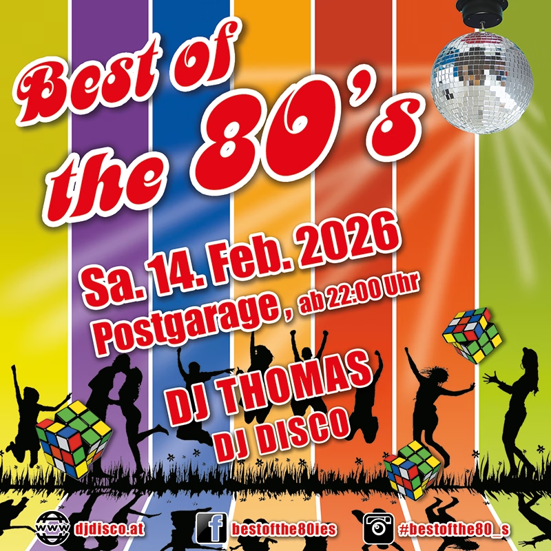 Am Samstag, den 14.02. ist es wieder soweit. Ab 22 Uhr öffnen wir die Pforten zur Februar Ausgabe von Best of the 80's, und alle Tanz- und Partyhungrigen Gäste sind wie immer herzlich eingeladen zu uns in die Postgarage zu kommen.
