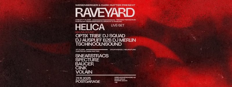 Das Jahr geht zu Ende, aber nicht ohne noch einmal zu fetten Beats mit Techno und Tekno bei RAVEYARD in der Postgarage abzufeiern. Diesmal haben wir HELICA vom Hakuna Soundsystem zu Gast und auch erstmalig ein neues Tek-Kollektiv aus Graz, RAVE-INC. Natürlich sind wieder unsere Residents OPTIX TRIBE DJ SQUAD dabei und TSCHINÖÖLENSOUND macht unser Lineup am 1st Floor komplett.