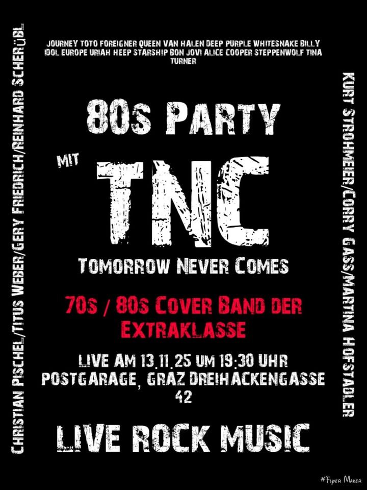 Am 13.11. 2025 geht’s wieder rund: 80s PARTY mit TNC – Tomorrow Never Comes!